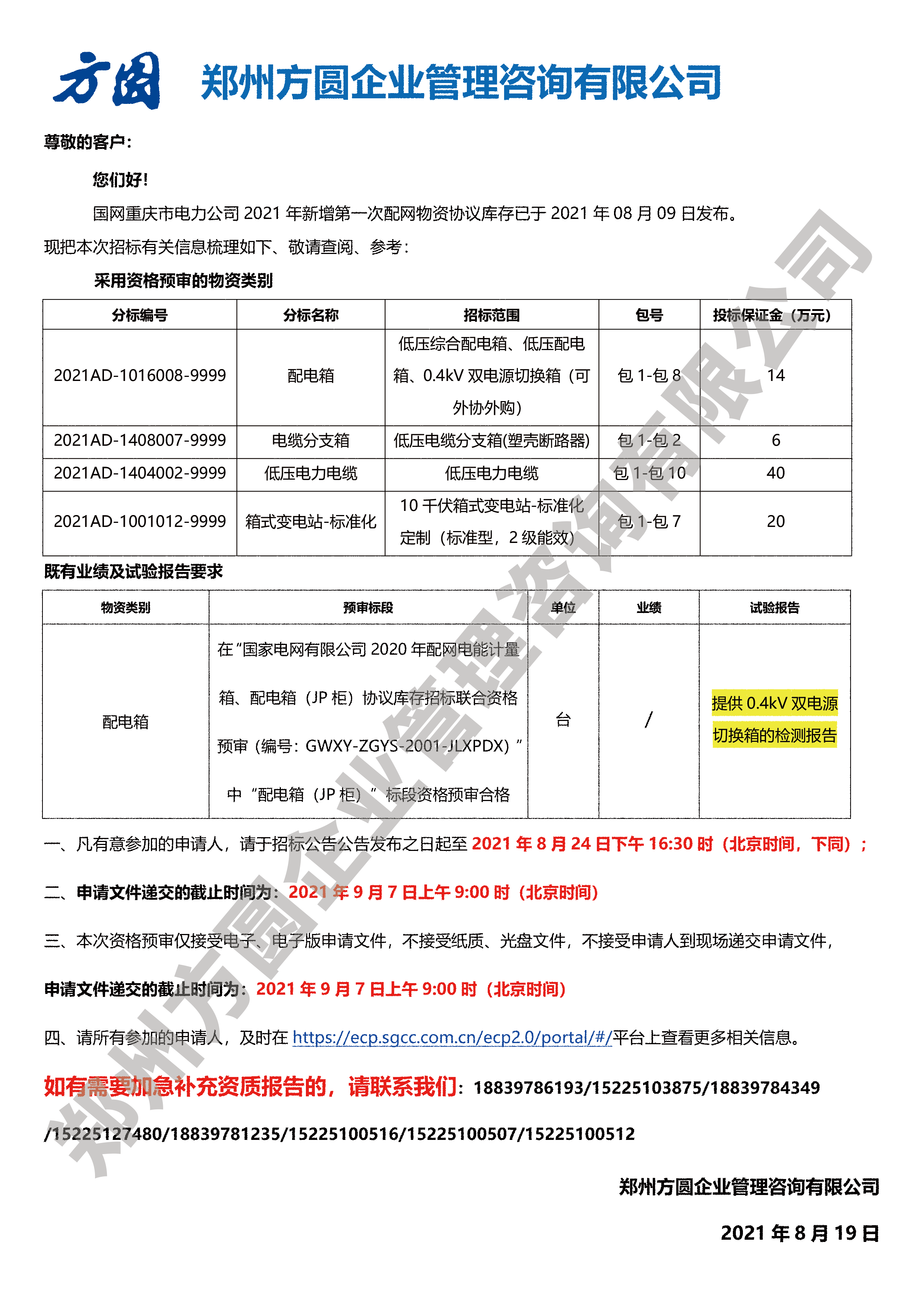 招标信息|国网重庆市电力公司2021年新增第一次配网物资协议库存招标信息